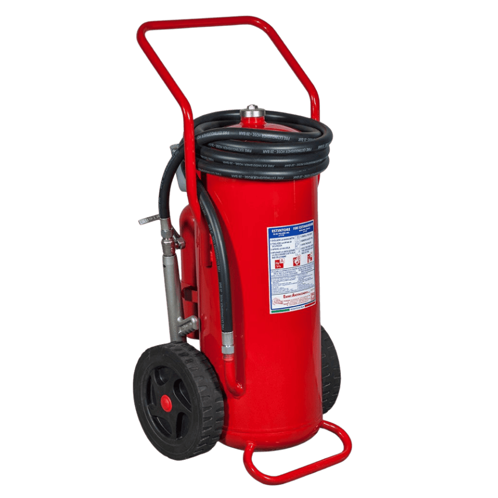 – Estintore carrellato a Polvere da 50 Kg, pressurizzato al momento dell’uso, temperatura di utilizzo da -30°C a +60°C, costruito in accordo alla norma UNI EN 1866-1 (D.M. 6.3.92) , certificato secondo la direttiva per attrezzature a pressione PED 2014/68/UE.