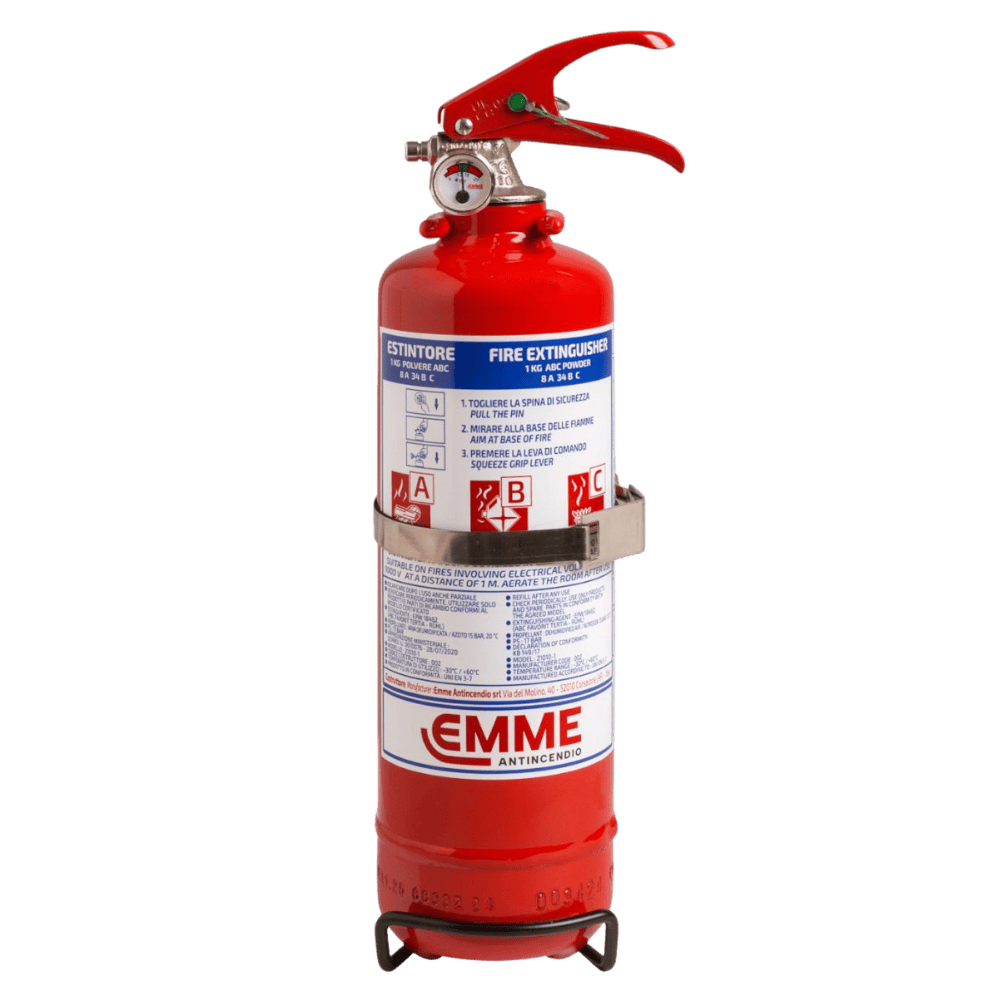 Estintore a polvere da 1 Kg , temperatura di utilizzo da -30°C a +60°C, costruito in accordo alla norma UNI EN 3-7, approvato Marine Equipment Directive MED 2014/90/UE, certificato secondo la direttiva per attrezzature a pressione PED 2014/68/UE, realizzato in conformità ai controlli di produzione secondo norma EN 3-10