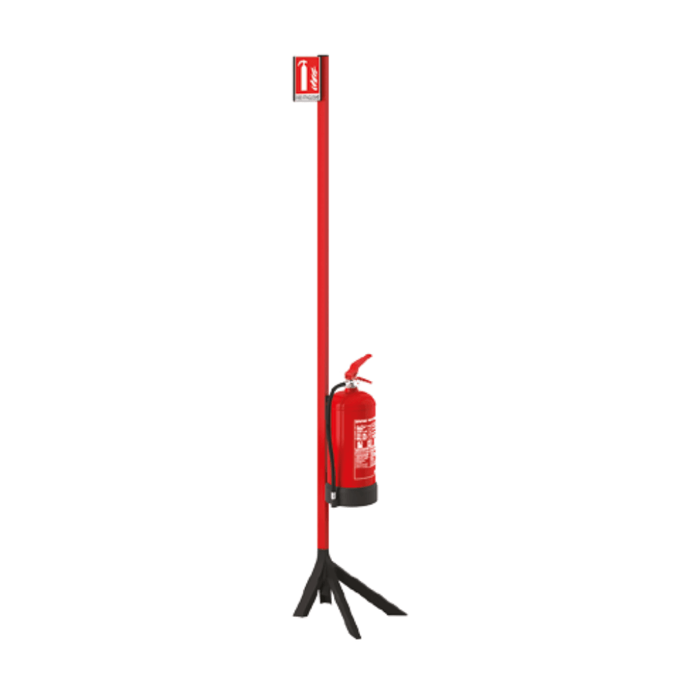 Piantana per estintore con base stabile e bandiera segnaletica, ideale per garantire visibilità, accessibilità e corretta segnalazione antincendio.